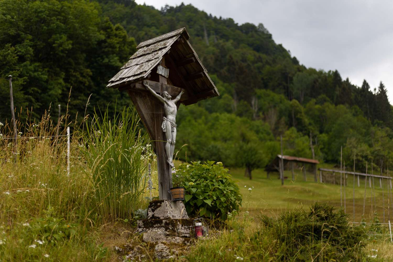 V kroniki je znamenje omenjeno v letu 1898, ko je opisan potek prošnje procesije, ki je bila za križev teden. Pred tem letom naj bi se procesija pričela ob tem znamenju na začetku vasi, tega leta pa je prvič krenila iz farne cerkve z Bohinjske Bele. Pri tem znamenju so jo pričakali domačini in se pridružili tudi z dvema lepima laternama. Prošnje procesije so se izvajale po tej trasi vse do leta 1946.