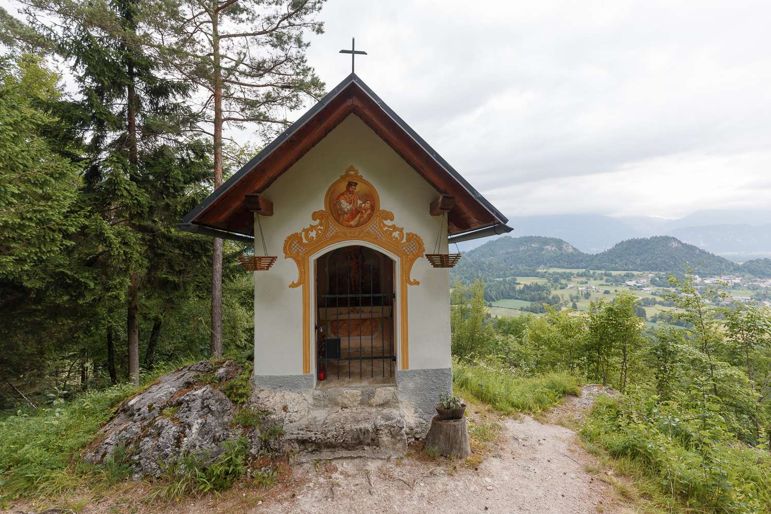 Kapelica stoji ob pešpoti s Sela preko Korena na Kupljenik na skalnem robu, od koder je prekrasen razgled na Savo Bohinjko, Bled, vasi okrog Bleda in okoliške hribe. Verjetno je bila postavljena kot obpotno znamenje k romarski cerkvi sv. Štefana na Kupljeniku. Zidana kapelica je bila postavljen v 50. letih 19. stoletja, kar je razvidno iz letnice 1857 na kovinski ograji. V njej je bil nameščen lesen križ. Po drugi svetovni vojni je začela propadati. Obnova se je pričela leta 2004 in zaključila z blagoslovom leta 2006. Znamenje je poslikala akademska slikarka Maša Bersan Mašuk. V notranjosti kapelice je upodobljen sv. Boštjan, ki je zavetnik vaščanov Sela. Na zunanji strani, na čelu znamenja, je freska sv. Valentina (Bavantina), ki je zavetnik in priprošnjik za vaščane Kupljenika.